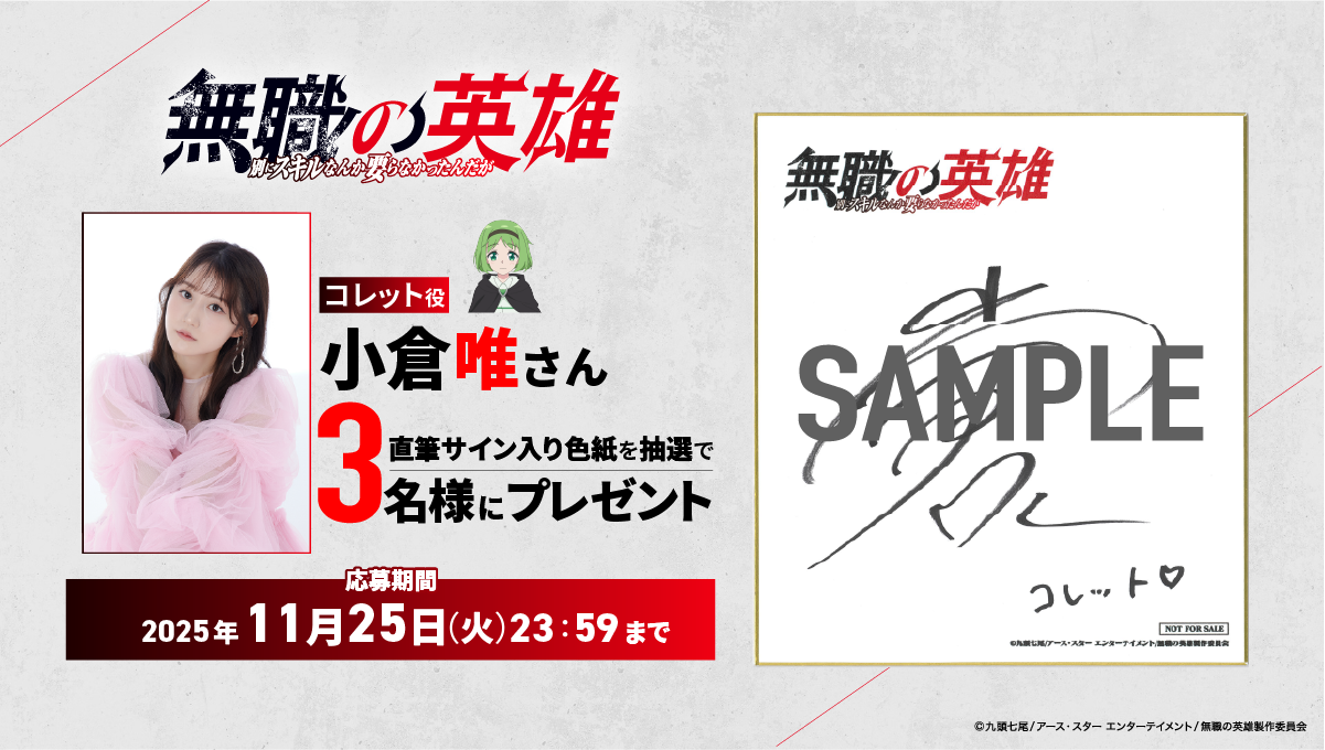 TVアニメ『無職の英雄 ~別にスキルなんか要らなかったんだが~』公式Xアカウントでは、本日11月19日(水)からコレット役 小倉唯さんサイン入り特製色紙のプレゼントのフォロー&RPキャンペーンを実施いたします。